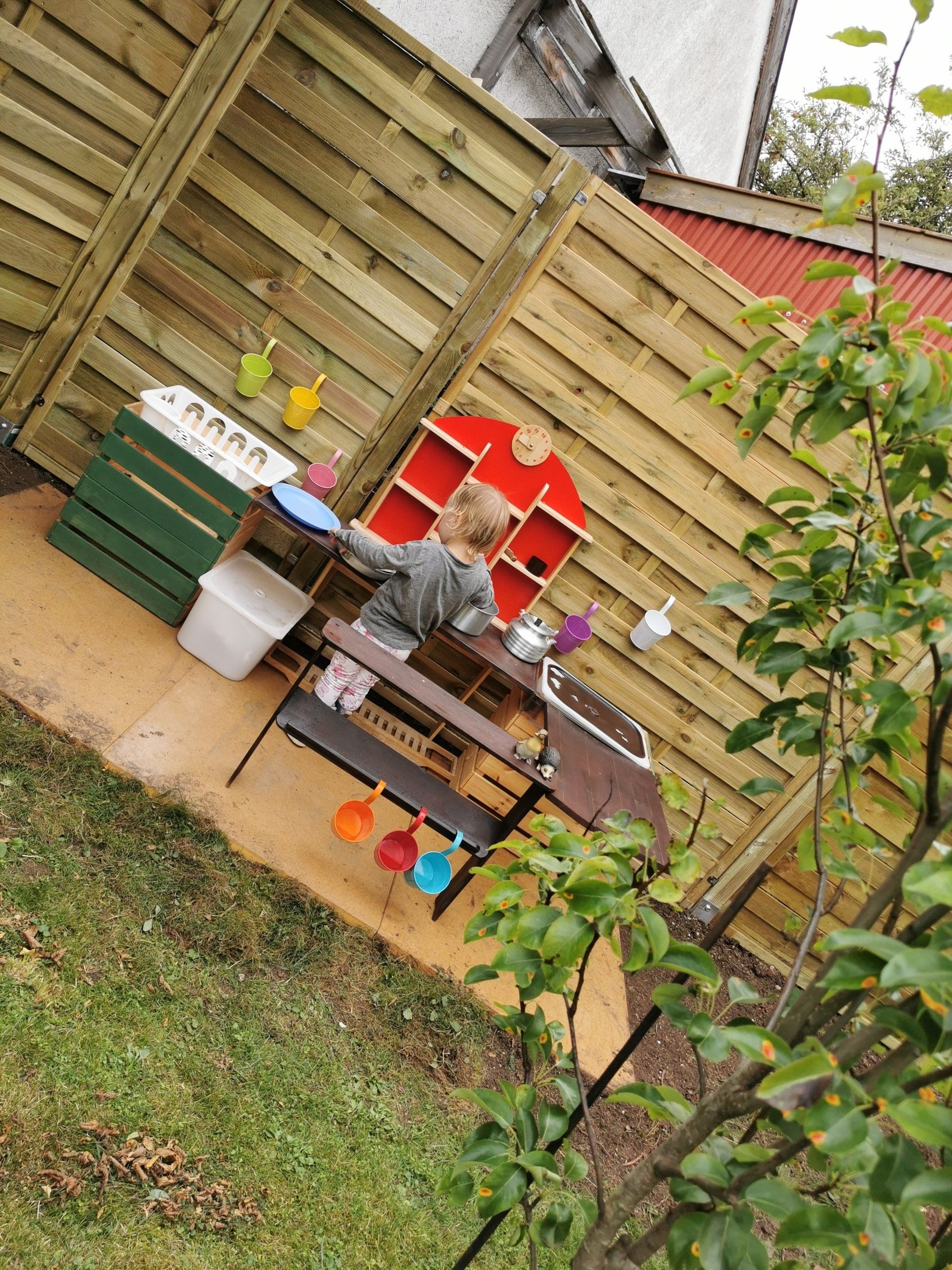 Hier gibt es einen großen Kletterturm mit Hängebrücke, Rutsche und zwei Schaukeln, sowie einen großen Sandkasten und eine Matschküche. Im Frühling und Sommer befindet sich auch ein großes Trampolin mit Sicherheitsnetz im Garten.